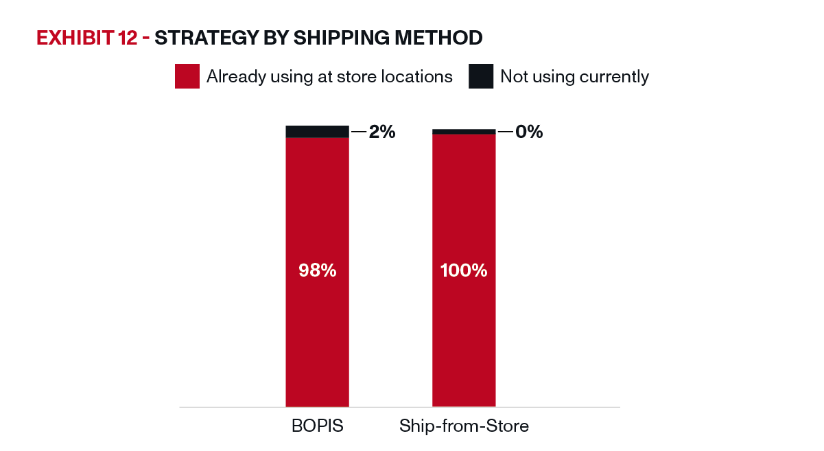 The adoption of buy online, pick up in-store (BOPIS) and other forms of click and collect, including curbside pickup, grew significantly as retailers worked to offset rising logistics and last-mile delivery costs. Exhibit 12 shows that today all retailers surveyed are using ship-from-store and 98% are offering BOPIS from at least some store locations, with 83% planning to expand these options to additional stores.